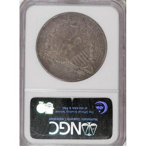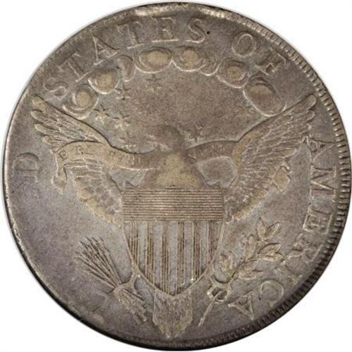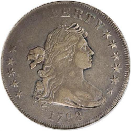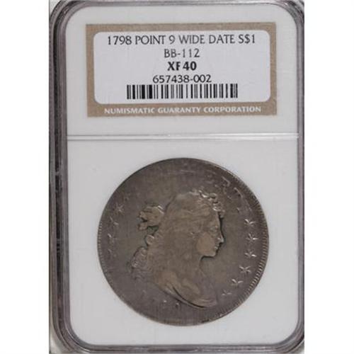 <B>1798 $1 Large Eagle XF40 NGC.</B></I> B-15, BB-112, R.3. Bowers' Die State II. A fascinating coin that will appeal to the error enthusiasts as much as to the early dollar specialists. Stars 6 and 7, as well as LI in LIBERTY are absent on the obverse, with all but the first and last letters of UNITED on the reverse missing. Closer examination reveals that the planchet is out of round, with the vertical axis being slightly shorter than the horizontal axis. An additional flat spot is noted on the rim at 5 o'clock. It is obvious that the missing design details are the result of improper metal flow, but a conclusive determination can not be made until this coin is removed from its holder and examined more closely. Of particular interest is the weight of the coin and the details present--or absent--from the edge. One thing for certain is that the current coin was struck on a flawed planchet and the resulting anomaly is not to be confused with postmint damage. NGC agreed and certified this piece as XF40, an accurate determination in our opinion. Medium gray toning reveals subtle hues of rose and gold when viewed at various angles. A couple of small rim ticks on the reverse at 12 o'clock are the only problems that are worthy of mention.<BR><BR><B>Coin Engraver:</B> Robert Scot<BR><BR><b>Shipping:</b> Coins & Currency (<a target="_blank" href="http://www.heritageauctions.com/common/shipping.php">view shipping information</a>)