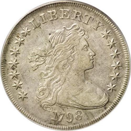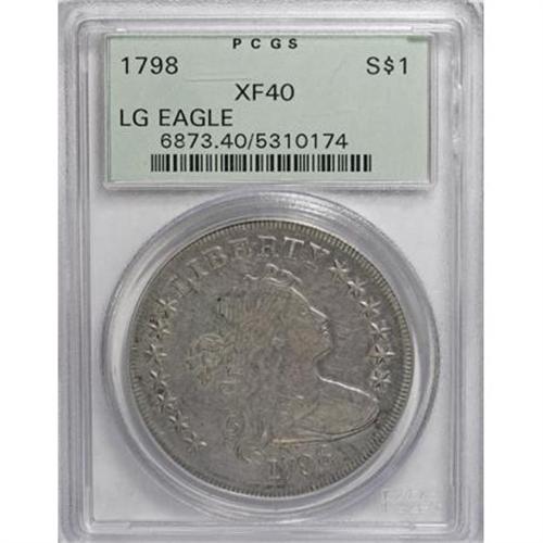 <B>1798 $1 Large Eagle XF40 PCGS.</B></I> B-30a, BB-116, R.5. Die State VI. Bolender only knew of one example in the terminal die state, a VG piece in his collection. More have been discovered since, but it is still a very rare die state. A pleasing, nicely detailed example with some weakness at the lower obverse and upper reverse due to die bulging in the latest die state. Attractive pewter gray surfaces exhibit splashes of darker peripheral toning on each side.<BR><I>Ex: Stack's (unknown sale), lot 1272.</B></I><BR><I>From The Queller Family Collection of Silver Dollars.</B></I><BR><BR><b>Shipping:</b> Coins & Currency (<a target="_blank" href="http://www.heritageauctions.com/common/shipping.php">view shipping information</a>)