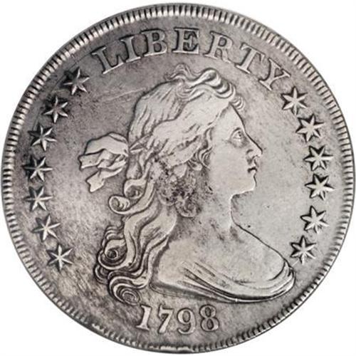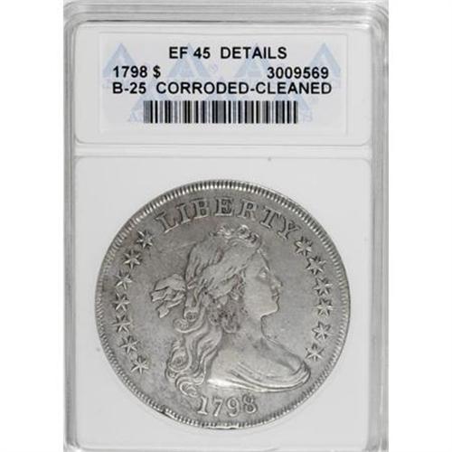<B>1798 $1 Large Eagle--Corroded, Cleaned--ANACS. XF45 Details. </B></I> B-25, BB-123, R.4. Bowers-Borckardt Die State III. Obverse die cracks. Blundered stars reverse. Well centered and well struck, except for noticeable weakness on the eagle's head and breast feathers. Evenly worn across each side. Rim damage is noted between 6 and 7 o'clock on the obverse. A few minor blemishes are observed, as expected for a lightly circulated example. <BR> <BR> <BR> <BR> <BR><BR><BR><B>Coin Engraver:</B> Robert Scot<BR><BR><b>Shipping:</b> Coins & Currency (<a target="_blank" href="http://www.heritageauctions.com/common/shipping.php">view shipping information</a>)