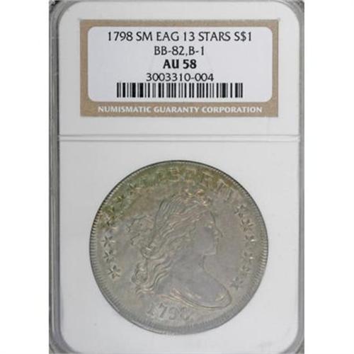 <B>1798 $1 Small Eagle, 13 Stars AU58 NGC.</B></I> B-1, BB-82, R.3. Die State III, also known as B-1a. The 13 Stars obverse was the second 1798 silver dollar struck after the 15 Stars obverse was coined. At least, this is the assumed emission sequence, since the 15 Stars obverse follows similar varieties coined in 1796, and the 13 Stars obverse was next, just prior to the Heraldic Eagle coinage that continued through the end of the Draped Bust series. In fact, this obverse die was used for 1798 B-32, the next coin in the emission sequence and considered the first 1798 Heraldic Eagle variety coined.<BR> The obverse die is lapped, apparently as always, with fragmented details at the lower hair curls, and at the top of the head. The reverse is shattered with all of the die cracks fully advanced, identical to the Bowers-Borckardt description for Die State III.<BR> A sensational example with virtually full luster and exceptional eye appeal. The fields display their full mint frost with only a trace of wear to break the luster. The fields have a soft, satiny appearance under warm gold and ivory toning. A few slight blemishes are barely worth mentioning. Examples of the 1798 Small Eagle silver dollars are seldom encountered in grades better than XF. Bowers writes: "Several hundred specimens exist, most of which are VF. EF examples are quire scarce, and any coin in better grade is rare. True Mint State coins are great rarities." Census: 7 in 58, 3 finer (12/07).<BR><BR><B>Coin Engraver:</B> Robert Scot<BR><BR><b>Shipping:</b> Coins & Currency (<a target="_blank" href="http://www.heritageauctions.com/common/shipping.php">view shipping information</a>)