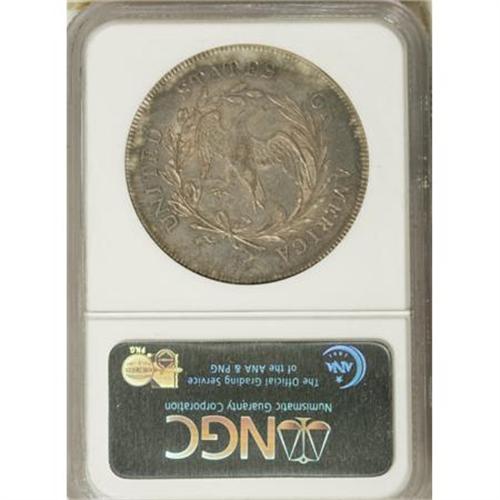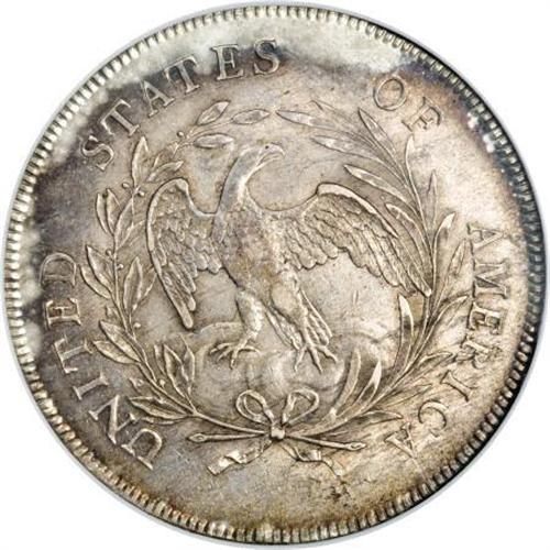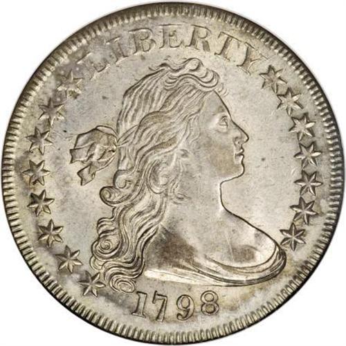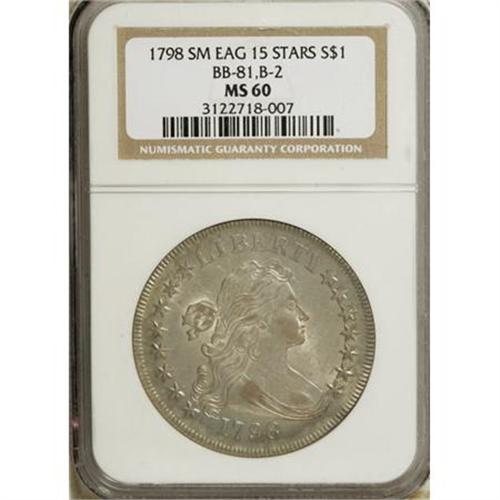 <B>1798 $1 Small Eagle, 15 Stars MS60 NGC.</B></I> B-2, BB-81, R.3. Unrecorded Die State. The 1798 Draped Bust, Small Eagle BB-81 silver dollar is the only die marriage of the issue that has 15 stars. It is well known that Tennessee, the 16th state, joined the Union on June 1, 1796, so only dies produced before that date would logically have had 15 stars. Numismatists theorize that the 15 Stars die was produced in 1795 without a final digit, then finished with an 8 in 1798 and pressed into service. (Bowers and Borckardt note an alternative explanation, a simple die-cutting error similar to the 1817 15 Stars cent.)<BR><B> </B></I>The 8 in the date is distinctive, with the top loop an oval lying on its side and the bottom loop a circle. This 8 is different from the 8 punches used for early-1800s dollars, and in fact is identical to the 8 punch used for the 1798 eagle gold coins. <BR> The Small Eagle reverse began to disappear from some coinage denominations, for example the gold half eagle and eagle, as early as 1797, but this Small Eagle reverse for the silver dollar was used in four consecutive years (at least according to the obverse dates), from 1795 through 1798, in pairings with six different obverse dies: the 1795 BB-51; the 1796 BB-62, BB-63, and (after relapping) the BB-66; the 1797 BB-72; and the 1798 BB-81. The reverse is easily distinguished by the presence of a berry under the A of STATES, but in this final incarnation for the reverse, the reverse definition is weak because of the noted relapping.<BR> This coin is in an unrecorded die state according to Bowers-Borckardt. While there is no evidence of a crack from under the chin to the border below star 15, there is a prominent die crack from between stars 6 and 7 to Liberty's hair ribbon. The highest hair curl is lapped and shows considerable incompleteness. This example displays numerous small contact marks on the central obverse, most of them only visible under a loupe, and elsewhere the light field chatter resolves only under magnification into wispy contact marks. The coloration on the obverse is predominantly grayish-gold with a touch of pink on the highpoints, but on the reverse there is a pinkish cast covering much of the coin save for the silvery rims.<BR><I>Ex: Stack's (privately, 3/1979).</B></I><BR><I>From The Queller Family Collection of Silver Dollars.</B></I><BR><BR><b>Shipping:</b> Coins & Currency (<a target="_blank" href="http://www.heritageauctions.com/common/shipping.php">view shipping information</a>)