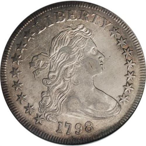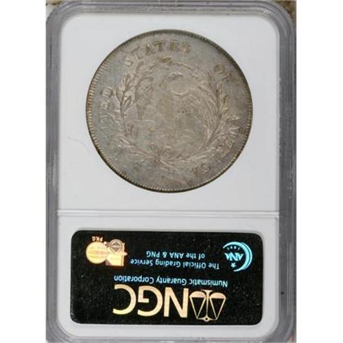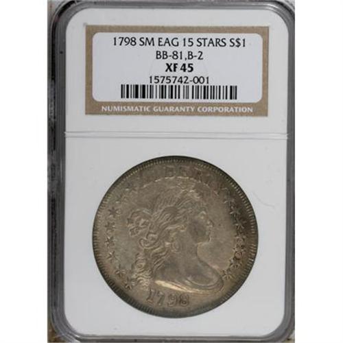 <B>1798 $1 Small Eagle, 15 Stars XF45 NGC.</B></I> B-2, BB-81, R.3. Bowers-Borckardt Die State II. There are 33 die varieties of 1798 dollars, and among those, only two bear the Small Eagle reverse first introduced in 1795. B-2 is the sole 1798 variety with 15 obverse stars, which implies the obverse die was made prior to June 1796, when Tennessee became the 16th state. The die was presumably complete save for the date, which was entered in 1798 when the die was removed from storage and prepared for coinage.<BR>This attractive example has a pleasing quota of shimmering luster within design recesses, particularly the hair. The eagle's body and Liberty's cheek and shoulder show the expected moderate wear, but the cream-gray and pale autumn-brown surfaces are generally smooth except for a thin reverse mark near 10 o'clock.<BR><BR><B>Coin Engraver:</B> Robert Scot<BR><BR><b>Shipping:</b> Coins & Currency (<a target="_blank" href="http://www.heritageauctions.com/common/shipping.php">view shipping information</a>)