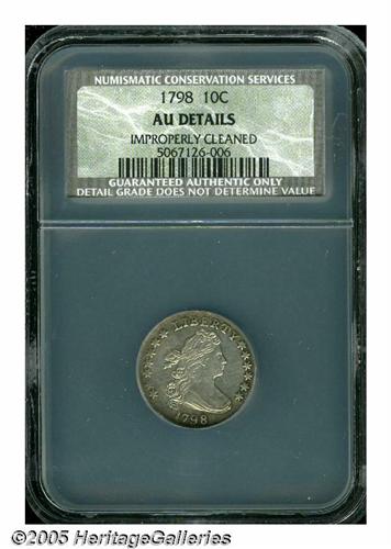 <B>1798<10C> Large 8 AU Details, Improperly Cleaned, NCS.</B></I> JR-4, R.3. Distinguished by the small 7 and large 8 in the date, and five berries on the branch. The JR reference estimates that some 45% of 1798 dimes are of this variety, and numerous high grade pieces are known. The surfaces on this piece are bright from cleaning and somewhat irregularly struck. Deeper color is seen around the margins.<BR><I>From The Empire State Collection.</B></I>