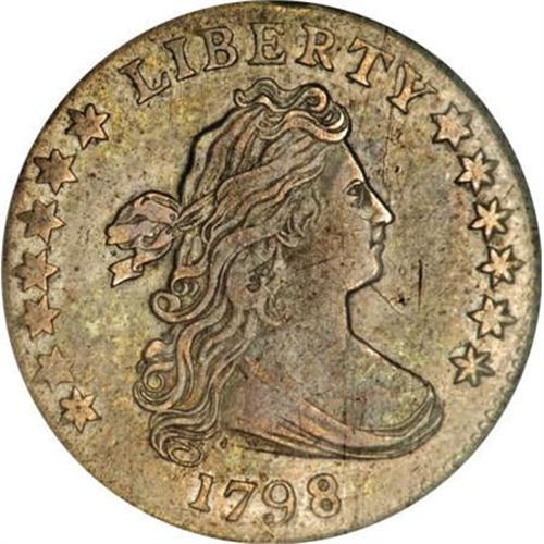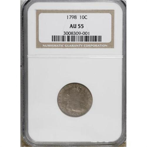 <B>1798 10C Large 8 AU55 NGC.</B></I> JR-4, R.3. The large 8 in the date is diagnostic for the obverse and for the die pairing by extension. The margins retain whispers of luster, while the silver-gray and golden-tan centers offer subtle luminosity. Just a trace of wear affects the highpoints, and an abrasion at the stars on the reverse is the only mark of note. Census: 2 in 55, 27 finer (12/07).<BR><BR><B>Coin Engraver:</B> Robert Scot<BR><BR><b>Shipping:</b> Coins & Currency (<a target="_blank" href="http://www.heritageauctions.com/common/shipping.php">view shipping information</a>)