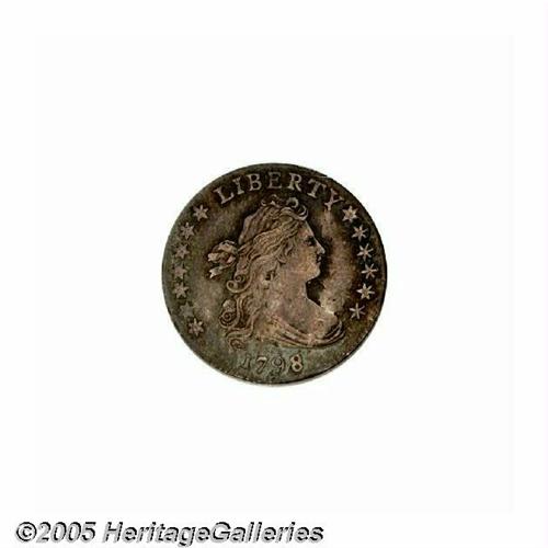 <B>1798<10C> Large 8 AU58 NGC.</B></I> JR-4, R.3. Lavender and olive hues embrace the obverse. The slightly lighter reverse is richly patinated in rose and ocean-blue colors. Liberty's cheek and shoulder show moderate friction from brief circulation, but extensive luster glimmers when the piece is rotated beneath a light. Crisply struck save for the right shield corner. A pinscratch at 7 o'clock on the reverse is distant from the focal points.