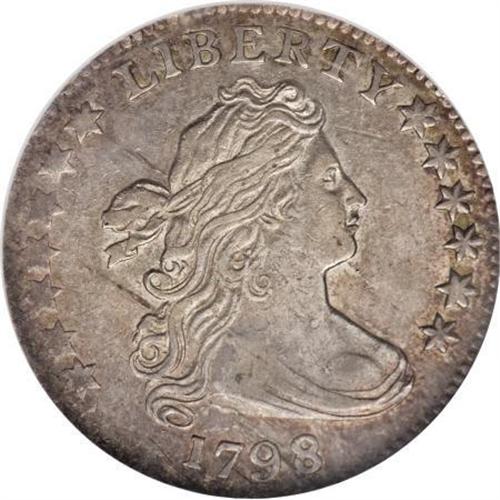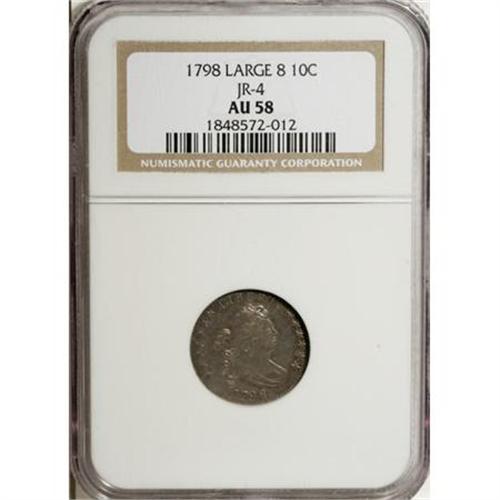 <B>1798 10C Large 8 AU58 NGC.</B></I> JR-4, R.3. A middle die state with obverse die cracks to the chin and nose, but no die break is yet present near the left wingtip. Luster dominates the hair, shield, and legends. The left side stars are soft, but the major devices are bold, with slight wear on the cheek and shoulder. The left obverse field has a pair of hair-thin laminations, as made, and a short mark is concealed on the field near the forehead.<BR><BR><B>Coin Engraver:</B> Robert Scot<BR><BR><b>Shipping:</b> Coins & Currency (<a target="_blank" href="http://www.heritageauctions.com/common/shipping.php">view shipping information</a>)