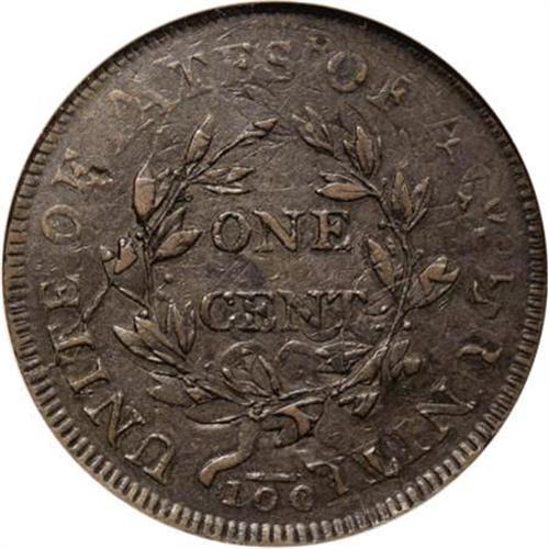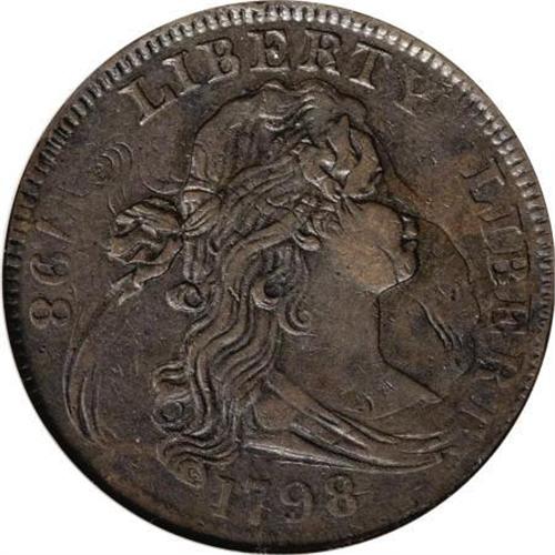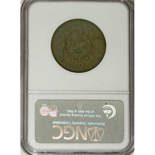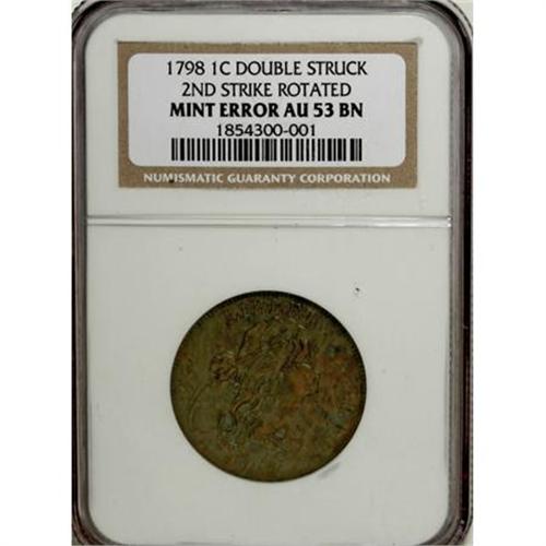 <B>1798 1C First Hair Style--Double Struck, Second Strike Rotated--AU53 NGC.</B></I> S-158, B-17, R.4. Breen Die State II with a heavy die crack near the T in UNITED. Medium brown and steel-blue with glimpses of golden-brown. Both strikes are independently normal, but the second strike is rotated 90 degrees CCW from the initial strike. Likely, the piece was struck, then inadvertently fed between the dies a second time. Even if this cent were not a significant mint error, it would still be important as a sharp, lightly abraded, nearly carbon-free, and partly lustrous representative of this scarce First Hair Style variety. EAC 30.<BR><BR><B>Coin Engraver:</B> Robert Scot<BR><BR><b>Shipping:</b> Coins & Currency (<a target="_blank" href="http://www.heritageauctions.com/common/shipping.php">view shipping information</a>)