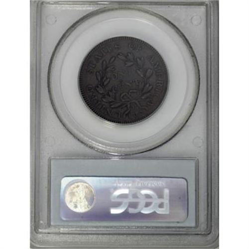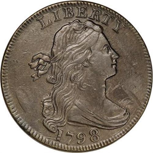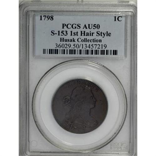<B>1798 1C First Hair. AU50 PCGS. S-153, B-12, R.3.</B></I> <B>Bland VF30; tied for CC-8. Noyes VF20; tied for CC-11. Photo #27638. Our EAC Grade VF30.</B></I><BR><BR><B>Equivalents.</B></I> Proskey 12; Doughty 120; McGirk 3E, 3E1, 3E2, 3E3; Clapp 11; EAC 13; <I>Encyclopedia </B></I>1719; PCGS #1431.<BR><BR><B>Variety. </B></I>Style I Hair. Large wide date, close to border. Short spurs inside top of O in OF. The obverse appears on S-153. The reverse appears on S-148, S-153, and S-168.<BR><BR><B>Surfaces.</B></I> Lovely chocolate-brown and lighter tan, with traces of deep steel toning, especially around the reverse devices. Some specks of light orange might suggest to some that this piece has been cleaned and recolored, expertly so if at all. A tiny rim nick at I of AMERICA is essentially invisible due to the PCGS holder. Double Flange Edge.<BR><BR><B>Die State VI. </B></I>A late but not terminal die state. All cracks described by Breen are present on this piece, although struck before the obverse rim break of State VII developed.<BR><BR><B>Census. </B></I>More than a dozen VF and XF examples of S-153 are known, with a single piece that Noyes grades AU50.<BR><BR><B>Commentary. </B></I>Following the three overdate varieties of Sheldon's Group 2 cents, the S-153 and S-154 die combinations are the only varieties of Group 3 (Style I hair, Style II letters, and Large 8). Both varieties are scarce, and elusive in higher grades. Only two pieces of the type grade better than XF, one of each die marriage according to Noyes.<BR><BR><B>Provenance. </B></I><I>L.R. Davis McKinney, Jr. (House of Davis McKinney, 1/1964), lot 233; Eugene Exman (1/1970); Denis W. Loring (9/1970); Dr. Dane B. Nielsen; Myles Z. Gerson; Denis W. Loring (10/1980); Thomas D. Reynolds; March Wells (Early American Coppers, 4/2002), lot 254, $2,000; Chris Victor-McCawley.</B></I><BR><BR><B>Personality. March Wells</B></I> was born in Grand Rapids, Michigan, in 1928 and is a resident of Kentucky who spends his winters in Juno Beach, Florida. John Ashby introduced him to large cents in the 1970s. Wells served as president of Early American Coppers from 1999 to 2002. Superior sold his middle date collection in February 2000.<BR><BR><b>Shipping:</b> Coins & Currency (<a target="_blank" href="http://www.heritageauctions.com/common/shipping.php">view shipping information</a>)