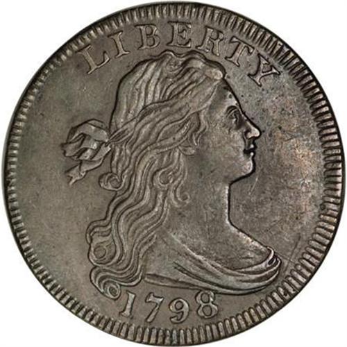 <B>1798 1C First Hair. AU50 PCGS. S-154, B-8, High R.4.</B></I> <B>Bland VF35; tied for CC-4. Noyes VF35; tied for CC-3. Photo #24244. Our EAC Grade VF35.</B></I><BR><BR><B>Equivalents.</B></I> McGirk 5A; Clapp 12; EAC 8; <I>Encyclopedia </B></I>1718; PCGS #1431.<BR><BR><B>Variety. </B></I>Style I Hair. Large 8 overlaps drapery. Style I Letters. The obverse appears on S-154. The reverse appears on S-154.<BR><BR><B>Surfaces.</B></I> Sharpness is about five points finer than the net grade. Pleasing olive and reddish-brown surfaces with a few splashes of dark green verdigris. The obverse has a few faint hairlines near the bust tip. Partially Reeded Edge.<BR><BR><B>Die State III. </B></I>Both dies are buckled, and the obverse has a radial die crack along the upper edge of the bust. This is the terminal die state according to Breen's list.<BR><BR><B>Census. </B></I>A single prooflike Mint State piece (graded MS70 by Sheldon, MS62 by Noyes, and MS60 by Bland) is followed by several XF and VF examples, including the Husak specimen that remains solidly in the traditional census of the six finest examples.<BR><BR><B>Commentary. </B></I>The rarity of this variety remains unchanged since the late 1940s, called Rarity-4 in <I>Early American Cents, Penny Whimsy, </B></I>and Breen's<I> Large Cent Encyclopedia</B></I>. Today, 60 years after publication of Sheldon's first book, it is considered High Rarity-4 with about 100 examples known.<BR><BR><B>Provenance. </B></I><I>David Proskey; Henry C. Hines; Dr. William H. Sheldon; C. Douglas Smith (3/1983); G. Lee Kuntz (Superior, 10/1991), lot 175, $2,750; Robinson S. Brown, Jr. (Superior, 1/1996), lot 216, $2,200.</B></I><BR><BR><B>Personality. G. Lee Kuntz</B></I> resides in Claremont, California, and is a veteran of World War II, serving in the Navy. He completed a collection of Sheldon-numbered varieties on January 29, 1989, the eighth such collection ever formed. Superior sold his collection in October 1991. Kuntz operates Masterpiece Medallions, producers of the Early American Coppers medallions in 1981, 1992, and 1997.<BR><BR><b>Shipping:</b> Coins & Currency (<a target="_blank" href="http://www.heritageauctions.com/common/shipping.php">view shipping information</a>)