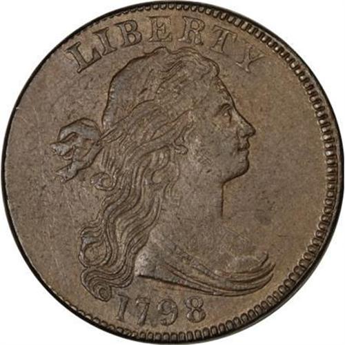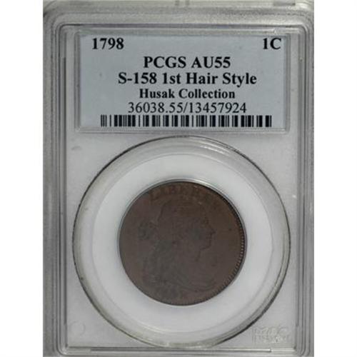 <B>1798 1C First Hair. AU55 PCGS. S-158, B-17, R.4. </B></I> <B>Noyes VF35; tied for CC-5. Photo #38427. Our EAC Grade XF40.</B></I><BR><BR><B>Equivalents.</B></I> Proskey 18; Doughty 126; McGirk 13A; Clapp 18; EAC 18; <I>Encyclopedia </B></I>1725; PCGS #1431.<BR><BR><B>Variety. </B></I>Style I Hair. LIB close, Y low. AMERICA widely spaced. The obverse appears on S-158 and S-159. The reverse appears on S-158 and NC-2.<BR><BR><B>Surfaces. </B></I>Glossy light brown surfaces with hints of frosty luster, accented by traces of pale blue toning and faded mint red. Essentially a Mint State coin. The surfaces are covered by tiny planchet chips and a low area at the lower left reverse, originating from grease on the die when the piece was minted. A few faint hairline scratches are evident on each side. Although most of the imperfections are mint-made, the net grade is discounted for the quantity of marks, both original and modern. Second Beaded Edge.<BR><BR><B>Die State IV. </B></I>The vertical obverse die cracks are nearly invisible and only seen with careful scrutiny. <BR><BR><B>Census. </B></I>Bland and Noyes both list the two finest coins as AU50, but opinions differ from there. A number of XF and VF examples are known, including this specimen from the Husak Collection, considered fifth finest with two other similar pieces listed in the Noyes roster.<BR><BR><B>Commentary. </B></I>In their catalog, Superior noted that this specimen is a new discovery not previously listed in census reports. Noyes calls it fifth finest known.<BR><BR><B>Provenance. </B></I><I>Long Beach (6/2001); Superior (1/2004), lot 1239, $8,625.</B></I><BR><BR><B>Personality. George Bailey</B></I> signed a bond of indemnity on August 31, 1799, promising to return to work after the annual yellow fever epidemic was over.<BR><BR><b>Shipping:</b> Coins & Currency (<a target="_blank" href="http://www.heritageauctions.com/common/shipping.php">view shipping information</a>)