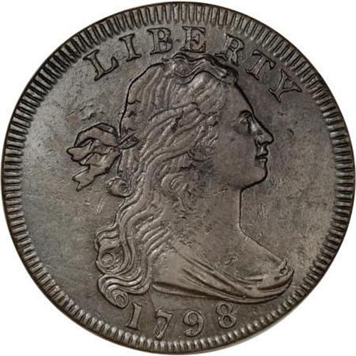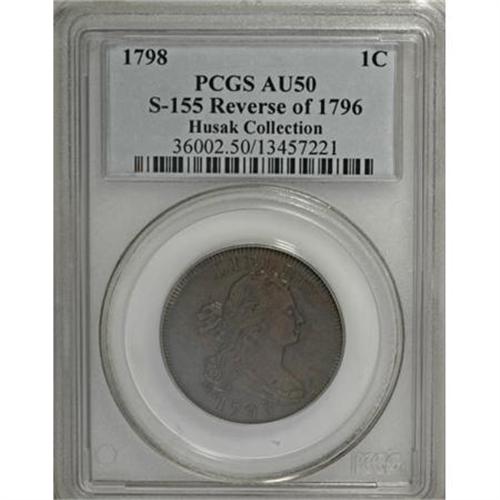 <B>1798 1C First Hair, Reverse of 1795. AU50 PCGS. S-155, B-9, R.3. </B></I> <B>Noyes VF25; CC-10. Photo #29089. Our EAC Grade VF30.</B></I><BR><BR><B>Equivalents.</B></I> Proskey 1; Doughty 110; McGirk 1A; Clapp 13; EAC 9; <I>Encyclopedia </B></I>1720; PCGS #1428.<BR><BR><B>Variety. </B></I>Style I Hair. Wide date and LIBERTY. Reverse of 1795, leaf pair at AM. The obverse appears on S-155. The reverse appears on 1796 S-87, S-88, S-89, and 1798 S-155.<BR><BR><B>Surfaces. </B></I>The surfaces have intermingled olive-brown and steel coloration with a few minor abrasions. This is a pleasing example of a popular variety that should garner considerable bidding activity from several different collector categories. Double Flange Edge.<BR><BR><B>Die State VI. </B></I>This specimen is the latest die state known with extensive die cracks, clash marks, and die chips in the drapery. The reverse has some central low areas, probably resulting from a trace of grease on the coinage die.<BR><BR><B>Census. </B></I>Bland considers the finest known an MS63 coin, while Noyes calls the same coin AU55. That coin is followed by a dozen examples that grade AU, XF, and VF, including the present piece that ranks 10th finest.<BR><BR><B>Commentary. </B></I>This is the important and popular 1798 type with the Reverse of 1795. There are actually three die varieties with this reverse type, including S-155 and S-156 with the first hair style, and S-178 with the second hair style. Of these, only the S-155 variety is relatively obtainable; the other two are important rarities for variety collectors. There are perhaps 300 to 400 examples of this variety known, with fewer than 100 of both other varieties combined.<BR><BR><B>Provenance. </B></I><I>Foreman;</B></I> <I>Stack's (1/1993), lot 1123, $3,080; Wes Rasmussen (Heritage, 1/2005), lot 3182, $4,313.</B></I><BR><BR><B>Personality. Wes Rasmussen</B></I> was born in Milwaukee, Wisconsin, on October 5, 1934, and currently resides in Las Vegas. He served as the sixth president of Early American Coppers from 1996 to 1999. Rasmussen spent his career in the printing business in Minnesota, and his company, Litho-Tech, printed <I>Penny-Wise</B></I> from 1986 through 2005. The firm also handled the printing needs for Bill Noyes' early-date book (1991) and his middle-date book, John Wright's middle-date reference (1992), and Bob Grellman's late-date book (1986). Rasmussen's collection of late-date cents was sold by Superior in 1998 and his early and middle-date collections were sold by Heritage in 2005.<BR><BR><b>Shipping:</b> Coins & Currency (<a target="_blank" href="http://www.heritageauctions.com/common/shipping.php">view shipping information</a>)