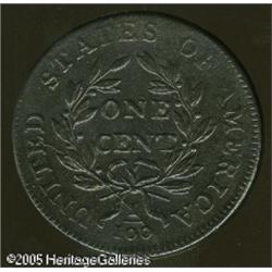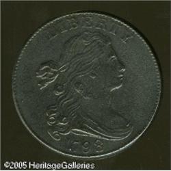 <B>1798 1C First Hair Style AU50 Corroded, Uncertified.</B></I> S-166, R.1. While known as the "Whisker Variety" because of a small spike under the chin, the most obvious diagnostic detail of this die pairing is the long, arcing die crack from the E in UNITED to the final 0 in the denominator. Glossy brown surfaces, noticeable porosity is seen overall. Excellent detail remains on this higher grade specimen. Lot:5122
