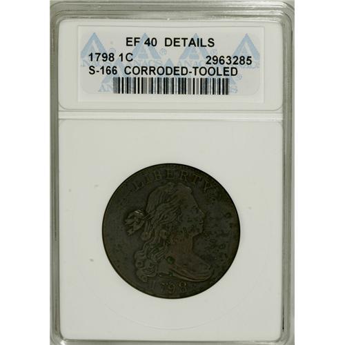<B>1798 1C First Hair Style--Corroded, Tooled--ANACS. XF40 Details.</B></I> S-166. NGC Census: (11/48). PCGS Population (18/35). Mintage: 1,841,745. Numismedia Wsl. Price for NGC/PCGS coin in XF40: $1,400. (#1431)<BR><BR><b>Shipping:</b> Coins & Currency (<a target="_blank" href="http://www.heritageauctions.com/common/shipping.php">view shipping information</a>)