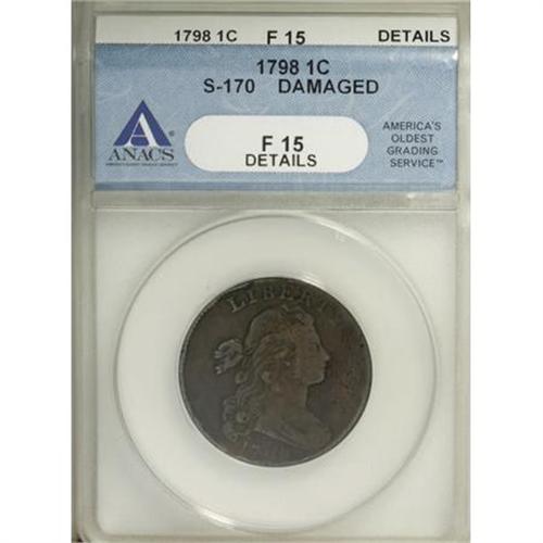 <B>1798 1C First Hair Style--Damaged--ANACS. F15 Details.</B></I> S-170. NGC Census: (3/99). PCGS Population (10/111). Mintage: 1,841,745. Numismedia Wsl. Price for NGC/PCGS coin in F15: $284. (#1431)<BR><BR><B>Coin Engraver:</B> Robert Scot<BR><BR><b>Shipping:</b> Coins & Currency (<a target="_blank" href="http://www.heritageauctions.com/common/shipping.php">view shipping information</a>)
