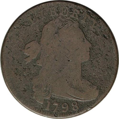 <B>1798<1C> First Hair Style. S-160, B-21, Low R.4--Corroded--NCS. Good Details. Good 4 EAC.</B></I> This dark-brown coin with lighter highpoints has uneven, advanced pitting and corrosion that prevents die state determination. The major design details are clear on the obverse, with the reverse slightly better and showing about one-quarter of the dentilation. The bust of Liberty is smooth, except for the deepest hair details.<BR><I> Ex: W.E. Johnson (1960); John A. Schreuder; Del Bland (5/27/1970).</B></I> Envelope Included.