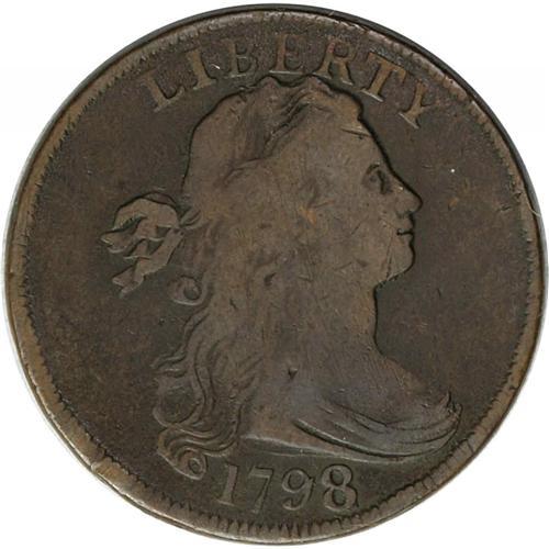 <B>1798<1C> First Hair Style. S-148, B-11, R.2--Obverse Scratched--NCS. VG Details.</B></I> Die State I. This variety has the horned 9 in the date, with the E in CENT below C-NT. In this die state there is a faint reverse die crack connecting NITED ST. This example is on a smooth, olive-brown planchet with lighter highpoints. Under magnification the obverse reveals many long, parallel, shallow scratches running from top to bottom of Liberty from the hairline to the neck. Another runs from the neckline across the neck to the juncture of the drapery and curls. The reverse is well detailed for the grade. Envelope Included.