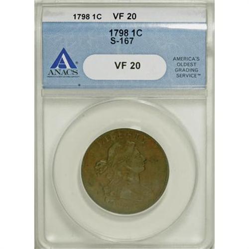 <B>1798 1C First Hair Style VF20 ANACS.</B></I> S-167. NGC Census: (5/94). PCGS Population (18/93). Mintage: 1,841,745. Numismedia Wsl. Price for NGC/PCGS coin in VF20: $400. (#1431)<BR><BR><B>Coin Engraver:</B> Robert Scot<BR><BR><b>Shipping:</b> Coins & Currency (<a target="_blank" href="http://www.heritageauctions.com/common/shipping.php">view shipping information</a>)