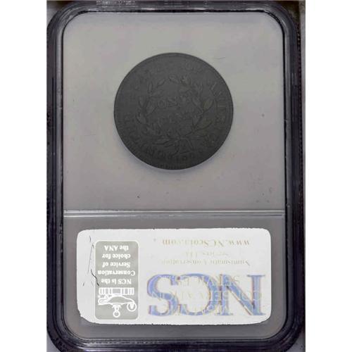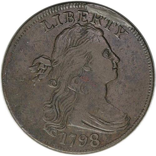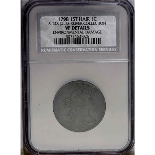 <B>1798<1C> First Hair Style. S-148, B-11, R.2--Environmental Damage--NCS. VF Details. Fine 15 EAC.</B></I> Die State VIII. A coin in the early stages of this last die state. A die crack runs from the right of the 8 into the drapery, issuing out the top of the drapery and merging with the rim above, but the rim has not yet broken and merged with the crack. Breen's large cent <I>Encyclopedia</B></I> calls this die state "scarce." An obverse rim break connects the tops of ERTY, while a wispy crack runs left through LIBE. On the reverse a crack runs along the tops of AMERIC. This medium-brown specimen is appealing and well detailed, particularly on the reverse. Perusal under a glass shows a nick in Liberty's middle curls and other smallish, grade-consistent abrasions.<BR><I> Ex: George Ramont (8/9/1977).</B></I> Envelope Included.