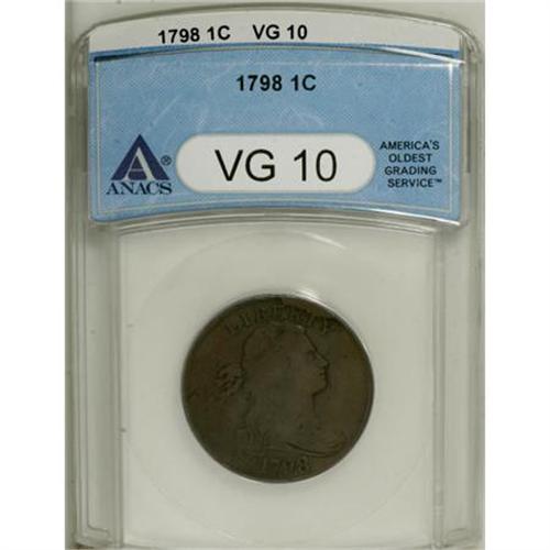 <B>1798 1C First Hair Style VG10 ANACS.</B></I> NGC Census: (7/109). PCGS Population (9/138). Mintage: 1,841,745. Numismedia Wsl. Price for NGC/PCGS coin in VG10: $175. (#1431)<BR><BR><B>Coin Engraver:</B> Robert Scot<BR><BR><b>Shipping:</b> Coins & Currency (<a target="_blank" href="http://www.heritageauctions.com/common/shipping.php">view shipping information</a>)