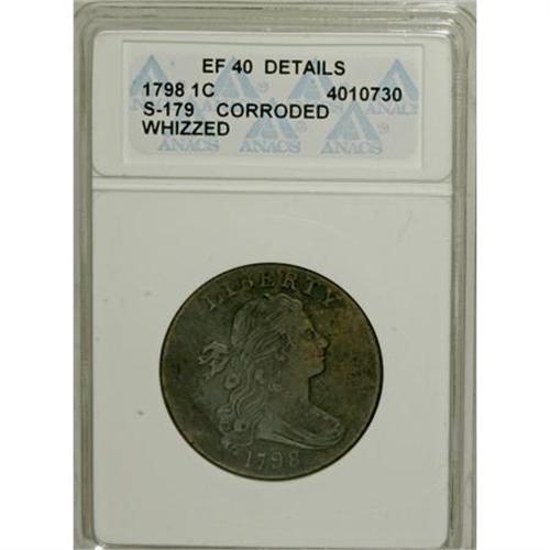 <B>1798 1C First Hair Style--Corroded, Whizzed--ANACS. XF40 Details.</B></I> S-179. NGC Census: (11/48). PCGS Population (18/34). Mintage: 1,841,745. Numismedia Wsl. Price for NGC/PCGS coin in XF40: $1,400. (#1431)<BR><BR><B>Coin Engraver:</B> Robert Scot<BR><BR><b>Shipping:</b> Coins & Currency (<a target="_blank" href="http://www.heritageauctions.com/common/shipping.php">view shipping information</a>)