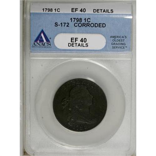 <B>1798 1C First Hair Style--Corroded--ANACS. XF40 Details.</B></I> S-172. NGC Census: (11/48). PCGS Population (18/34). Mintage: 1,841,745. Numismedia Wsl. Price for NGC/PCGS coin in XF40: $1,400. (#1431)<BR><BR><B>Coin Engraver:</B> Robert Scot<BR><BR><b>Shipping:</b> Coins & Currency (<a target="_blank" href="http://www.heritageauctions.com/common/shipping.php">view shipping information</a>)