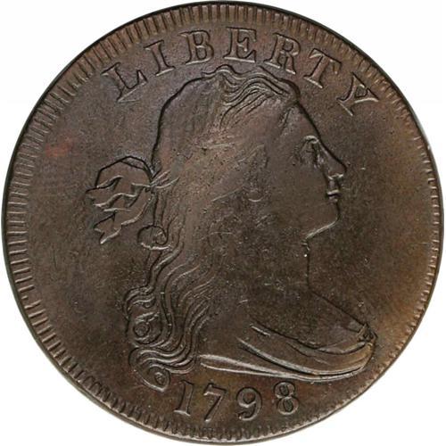 <B>1798<1C> First Hair Style. S-161, B-22, R.1--Improperly Cleaned--NCS. XF Details. VF25 EAC.</B></I> Die State II. This lovely coin seems to be in an intermediate die state, showing some but not all of the characteristics of Die State II, and others from Die State III as Walter Breen outlines in his large cent <I>Encyclopedia.</B></I> There are obverse crack marks on the drapery extending through the bust, but no diagonal crack is visible through the L in LIBERTY. There is a reverse crack from the loop of D that rises to the rim, with another faint crack that joins the bottom of D with the nearby leaf. A crack through AT continues to E, then rises to the rim and runs along it above the final S and the space before descending slightly toward the top of the O, where it terminates. There is no trace of a crack through UNITE, but bulging is beginning at STAT. Despite evidence of cleaning this coin has appealing, glossy medium-brown surfaces that are free of all but the most insignificant marks. The dentilation is full if imperfectly centered on both sides, and all devices show bold detail. The reverse die is rotated about 30 degrees counterclockwise. An appealing and interesting specimen.<BR><I> Ex: Henry C. Hines; Stack's (10/1949), lot 224; Willard C. Blaisdell (2/8/1971).</B></I> Envelope Included.