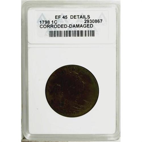 <B>1798 1C First Hair Style--Corroded, Damaged--ANACS. XF45 Details.</B></I> NGC Census: (15/33). PCGS Population (11/23). Mintage: 1,841,745. (#1431)<BR><BR><B>Coin Engraver:</B> Robert Scot<BR><BR><b>Shipping:</b> Coins & Currency (<a target="_blank" href="http://www.heritageauctions.com/common/shipping.php">view shipping information</a>)