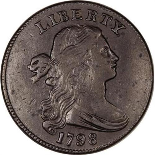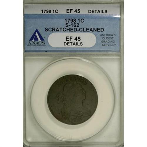 <B>1798 1C First Hair. XF45 Details, Scratched, Cleaned, ANACS. S-162, B-23, R.4.</B></I> <B>Bland VF25; tied for CC-5. Noyes Fine 15; tied for CC-14. Photo #28428. Our EAC Grade VF25.<BR><BR>Equivalents.</B></I> Clapp 22; EAC 23; <I>Encyclopedia </B></I>1723; PCGS #1431.<BR><B><BR>Variety. </B></I>Style I Hair. Blunt 1, round knob 9. Lines from rim to ER. The obverse appears on S-162. The reverse appears on S-160, S-162, and S-176.<BR><B><BR>Surfaces.</B></I> Reverse graffiti is confined mostly to the area between the branches and above ONE. Some slight low areas outside the right branch result from light grease on the die. Double Flange Edge.<BR><B><BR>Die State II. </B></I>The obverse is noticeably bulged, and the reverse has light clash marks below S O.<BR><B><BR>Census. </B></I>One lovely Mint State coin is known, followed by a VF35 piece in second position. About a dozen VF coins are known in total. In <I>Penny Whimsy</B></I>, Sheldon recorded two different Mint State pieces.<BR><B><BR>Commentary. </B></I>Like many of the early cents, the rarity of S-162 has dropped substantially over the years. In <I>Early American Cents</B></I>, Sheldon rated this variety R-5, and in <I>Penny Whimsy</B></I> he noted it was not far from R-6. Years later, Breen rated it Low R-4 in his <I>Large Cent Encyclopedia</B></I>.<BR><B><BR>Provenance. </B></I><I>Dr. George French (B. Max Mehl, 1929 FPL), lot 219, $60; Henry A. Sternberg (8/1930); T. James Clarke (10/1954); R.E. Naftzger, Jr. (Abe Kosoff, 4/1956), lot 56, $52; Glen Wallace; Ace Reiswig; Robert E. Vail (1988); Del Bland; Dr. Philip Ralls; Robinson S. Brown, Jr. (Superior, 1/1996), lot 227, $1,815.</B></I><BR><B><BR>Personality. Henry A. Sternberg </B></I>(1875-1955) operated a general store in Dundee, Illinois. He retired from business in 1923. Sternberg collected large cents and other coins, purchasing pieces from the French and Beckwith Collections. He sold pieces through J.C. Morgenthau in 1933. M.H. Bolender sold most of his collection in March 1956.<BR><BR><b>Shipping:</b> Coins & Currency (<a target="_blank" href="http://www.heritageauctions.com/common/shipping.php">view shipping information</a>)