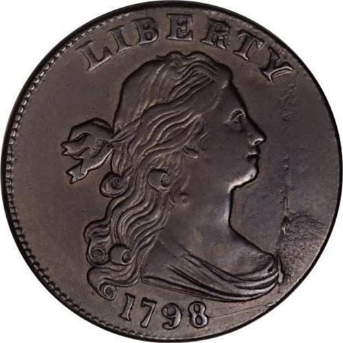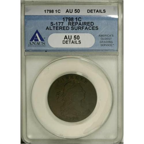 <B>1798 1C Second Hair. AU50 Details, Repaired, Altered Surfaces, ANACS. S-177, B-25, High R.4.</B></I> <B>Bland VF20; tied for CC-6. Noyes Fine 15; tied for CC-7. Photo #27877. Our EAC Grade Fine 12.<BR><BR>Equivalents.</B></I> Clapp 37; EAC 25; <I>Encyclopedia </B></I>1729; PCGS #1434.<BR><B><BR>Variety. </B></I>Style II Hair. LIBERTY wide, LI close. Style I Letters. The obverse appears on S-176, S-177, and S-178. The reverse appears on S-177.<BR><B><BR>Surfaces.</B></I> Rich olive-brown color with splashes of lighter tan. The surfaces are burnished, especially evident on the obverse, yet the overall appearance is respectable. Plain Edge.<BR><B><BR>Die State V. </B></I>The latest die state with advanced cracks on the obverse. A patch of rust is evident at the lower right obverse. The reverse has several sets of clash marks, primarily from the drapery.<BR><B><BR>Census. </B></I>The finest known S-177 grades just VF30, with a small number of other VF coins recorded by Bland and Noyes. The ANS holds one of the top six examples, limiting the number of census level pieces available to collectors.<BR><B><BR>Commentary. </B></I>The obverse die cracked during its earliest use with S-176 but remained in the press to produce three different die combinations. The vertical crack is distinctive, and diagnostic of this obverse die.<BR><B><BR>Provenance. </B></I><I>Charles J. Dupont (Stack's, 9/1954), lot 252, $100; Dorothy Paschal (1972); Robinson S. Brown, Jr. (Superior Galleries, 9/1986), lot 250, $1,485; Thomas D. Reynolds.</B></I><BR><BR><B>Personality. Charles Dupont</B></I> and his partner, Charles Anderson, were antique dealers in Worcester, Massachusetts, who served as agents for the sale of a coin collection via Stack's auctions. The sales were held in September and November 1954, billed as the Anderson Dupont Sales. The large cents were cataloged by Sheldon and Breen.<BR><BR><b>Shipping:</b> Coins & Currency (<a target="_blank" href="http://www.heritageauctions.com/common/shipping.php">view shipping information</a>)