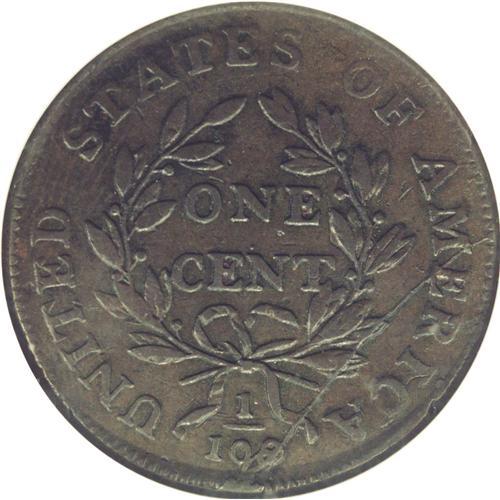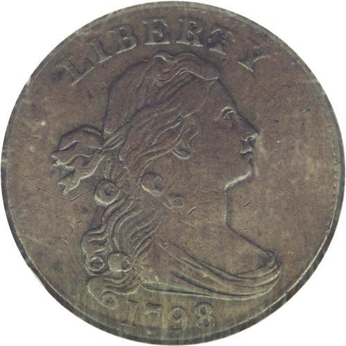 <B>1798<1C> Second Hair Style AU50 NGC.</B></I> S-186, R.2. A bold arc die crack on the lower right reverse and a lighter arc die crack on the upper right obverse promptly identify this Second Hair Style Sheldon variety. This splendidly detailed piece features consistent medium brown color and is nearly free from verdigris. A pinscratch beneath the hair ribbon provides the only remotely mentionable mark. EAC 20.