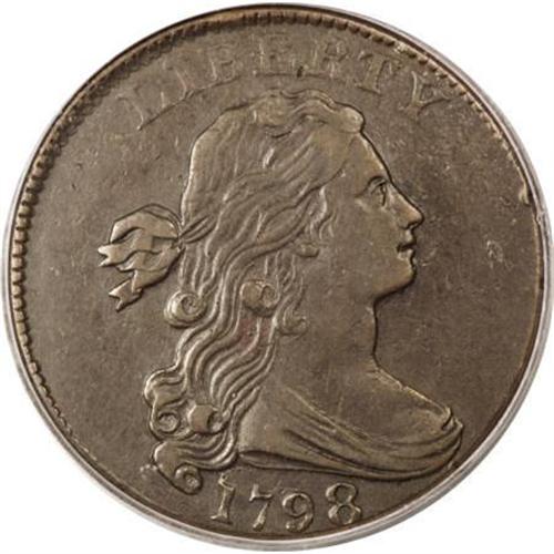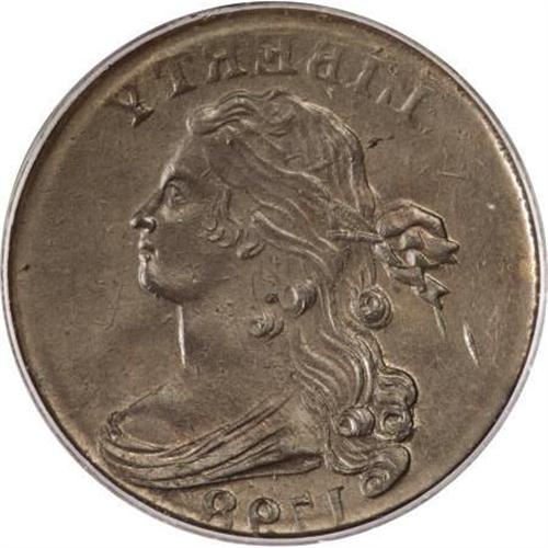 <B>1798 1C Second Hair Style--First Strike Brockage Reverse--AU50 PCGS.</B></I> Obverse die of S-165, 166, and 167. The Second Hair Style with a Large 8 in the date. Only one obverse die was created with the combination of these features. Sheldon nicknamed the obverse the "Whisker Variety" for a tiny die chip on the lower edge of the chin, visible on both the normal image and the brockage image of this piece. It is a spectacular piece with medium brown surfaces and extraordinary eye appeal.<BR> Attempting to narrow the variety choices is a fine numismatic pursuit. Working backwards, S-167 always comes with an obverse die crack through the 8 in the date. The present example has no obverse die cracks, so S-167 is eliminated. There is no bulge behind the low curls, as it appears on State III of S-166. Faint clash marks at Liberty's throat are seen on States I and II of S-166, and States II and III of S-165, and those are the choices. We feel strongly that this example is S-165. EAC 40.<BR><I>Ex: C. Douglas Smith; Robert A. Schuman (McCawley and Grellman, 9/2004), lot 369.</B></I><BR><BR><b>Shipping:</b> Coins & Currency (<a target="_blank" href="http://www.heritageauctions.com/common/shipping.php">view shipping information</a>)