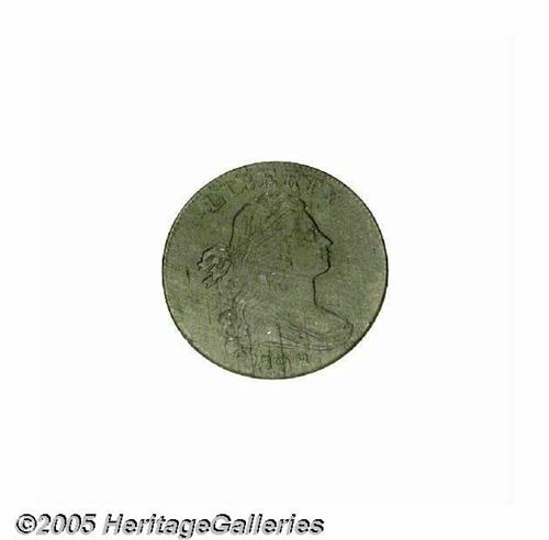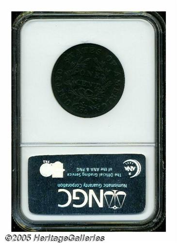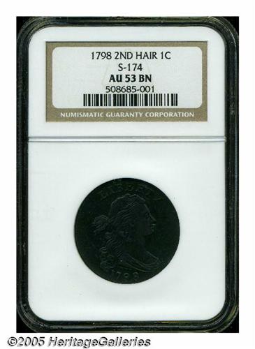 <B>1798<1C> Second Hair Style AU53 NGC.</B></I> S-174, Low R.2. A smooth ebony-brown piece, evenly struck and splendidly detailed. Mint-made clash marks outline the devices, however, post-strike marks are limited to a few tiny ticks on the portrait and a wispy pinscratch near 8 o'clock. Sheldon-174 is identified by a defective left top of the M in AMERICA and a small projection on the top of the 1 in the date.