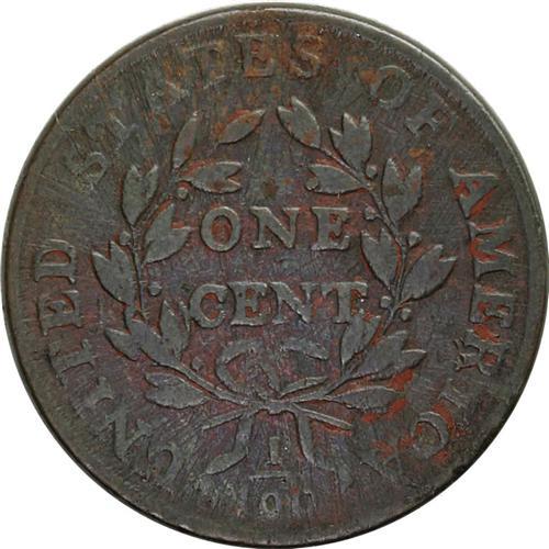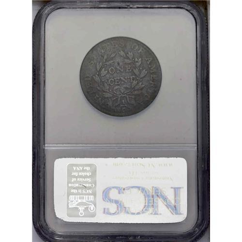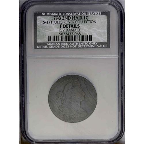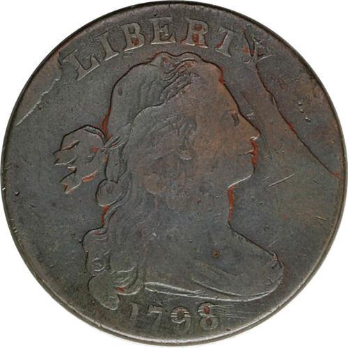 <B>1798<1C> Second Hair Style. S-171, B-30, R.4--Reverse Damage--NCS. Fine Details. Good 6 EAC.</B></I> Die State V. Breen call this die state "very rare." There is a large obverse die crack that arcs from the rim above TY back to the rim before Liberty's chin. Unfortunately, the reverse has innumerable scrapes running in all directions from some kind of abrasive treatment. These scrapes are light and shallow, so considerable reverse detail remains. There is a reddish color in the protected areas, as though the coin were coated with something at one time that has largely worn off or been scraped off. Fortunately, the obverse was spared these indignities, and it offers a fairly smooth, occasionally pitted medium-brown surface that reveals a few abrasions on Liberty's neck. Perusal with a glass also shows a few light scrapes through the date and in the right obverse field.<BR><I>Ex: Newtown (1/15/1988).</B></I> Envelope Included.