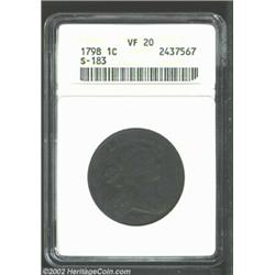 1798 1C Second Hair Style VF20 ANACS. S-183, High R.5. LIBERTY is high with IB closely spaced, while the reverse has a die line (as made) through the right ribbon near the end. A dark purple-brown Cent that has only a faintly granular surface. Boldly detailed except for the bottom third of the date. A pleasing example of this rare variety. Jack Robinson's Condition Census ends with VG10, and while he uses strict EAC standards, this Cent may compete for a position within that listing. Important notice: We expect to be auctioning lots at the rate of 200-250 per hour. Sometimes eBay Premier live bid software cannot keep up with that pace, so we strongly recommend that you place a realistic proxy bid now as insurance to avoid disappointment. Also please note that all Heritage/CAA lots purchased through eBay Premier carry a 20% Buyer's Premium. Please make sure you read the Terms and Conditions.