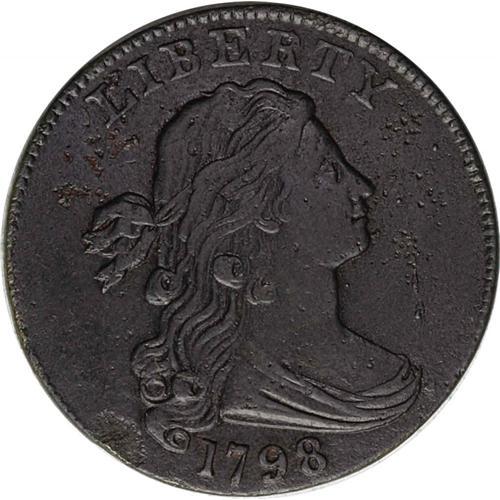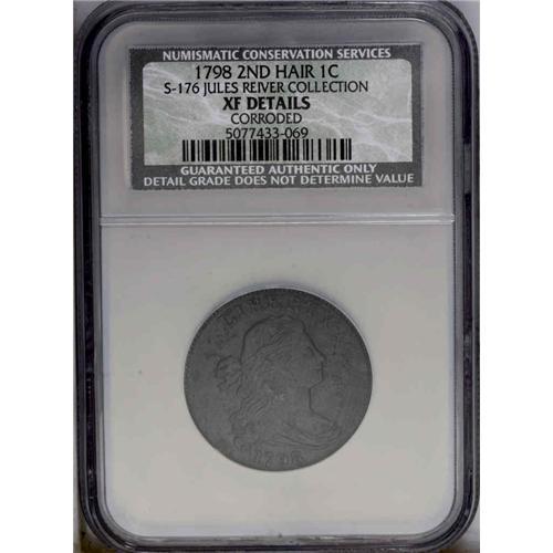 <B>1798<1C> Second Hair Style. S-176, B-24, Low R.4--Corroded--NCS. XF Details. Fine 12 EAC.</B></I> Die State V. This coin is corroded, but the corrosion is largely uniform, with the worst areas in the obverse fields, above the diagnostic linear die crack and above the hair ribbon. However, it is also strong in its peripheral details, more so than some coins on less problematic planchets. The date on this interesting obverse die, with hand-strengthened digits that Sheldon called "crude or homemade," is bold and full, as are LIBERTY and the reverse legends. Liberty's highpoint hair curls are full and well delineated. The reverse shows the characteristic clash marks from obverse drapery and dentils near TES OF AMER. The color is olive-brown. Despite the accurate NCS designation, a pleasing and scarce coin.<BR><I>Ex: George Ramont.</B></I> Envelope Included.