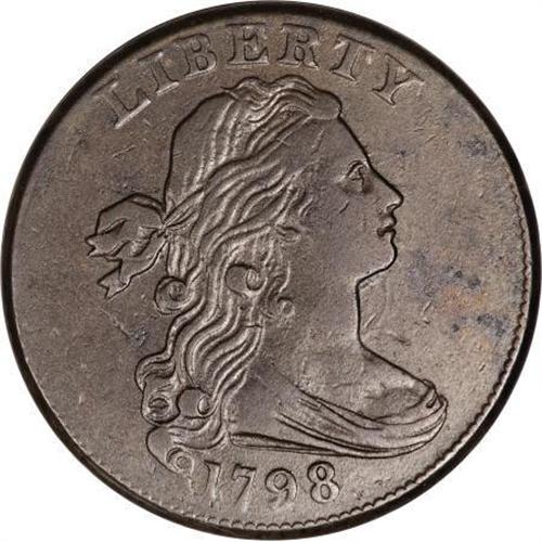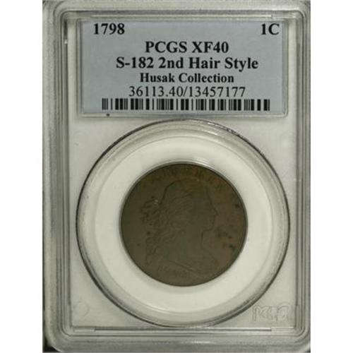 <B>1798 1C Second Hair. XF40 PCGS. S-182, B-43, R.4. </B></I> <B>Noyes VF25; CC-8. Photo #28634. Our EAC Grade VF25.</B></I><BR><BR><B>Equivalents.</B></I> Clapp 42; EAC 43; <I>Encyclopedia </B></I>1729; PCGS #1434.<BR><BR><B>Variety. </B></I>Style II Hair. Missing hair above 1. Die scratch from A to right ribbon. The obverse appears on S-182. The reverse appears on S-182, S-183, and S-184.<BR><BR><B>Surfaces.</B></I> Mostly light olive-brown with a few splashes of darker steel color. A few tiny surface marks but overall an attractive piece. Plain Edge.<BR><BR><B>Die State II. </B></I>Single clash marks.<BR><BR><B>Census. </B></I>This S-182 falls outside the Bland Census, but is listed as eighth finest in the Noyes roster. Finest known is a Mint State piece, followed by two XF examples and several grading VF.<BR><BR><B>Commentary. </B></I>This is the first of three die combinations from a single reverse die that is immediately recognized by a die scratch from the final A to the right ribbon end. This is another simple attribution point that will aid in identification of the various 1798 varieties.<BR><BR><B>Provenance. </B></I><I>David Proskey; Henry C. Hines; Dr. William H. Sheldon; C. Douglas Smith; Kenneth Rendell; Old Colony Coin (10/1958), lot 902; Dorothy Paschal (1973); Robinson S. Brown, Jr. (Superior, 9/1986), lot 255, $687.50; Dave Liljestrand; Chris Victor-McCawley (2/1989); Robinson S. Brown, Jr. (Superior, 1/1996), lot 249, $1,045.</B></I><BR><BR><B>Personality. Old Colony Coin Co.</B></I> is best known in large cent circles for their sale in conjunction with the New England Numismatic Association in October 1958.<BR><BR><b>Shipping:</b> Coins & Currency (<a target="_blank" href="http://www.heritageauctions.com/common/shipping.php">view shipping information</a>)