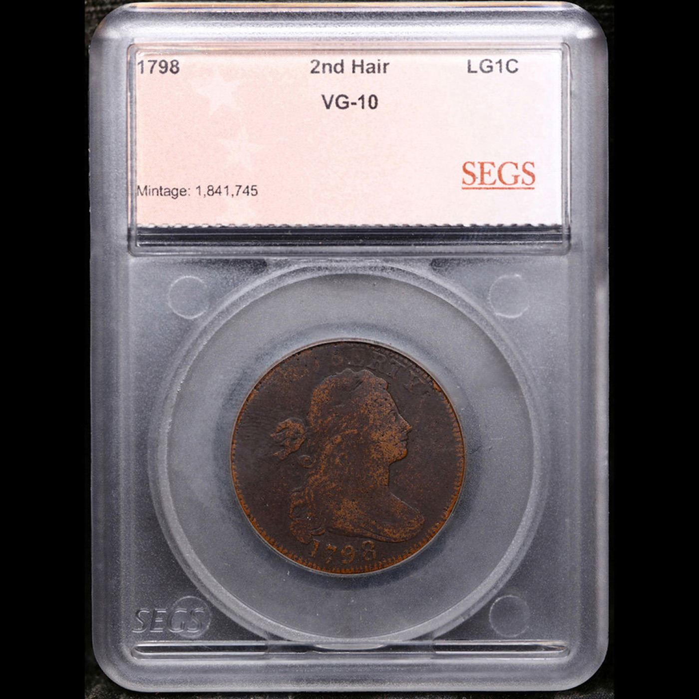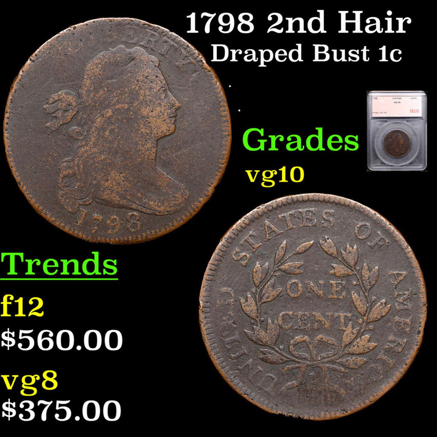 1798 2nd Hair Draped Bust Large Cent 1c Graded vg10 By SEGS.