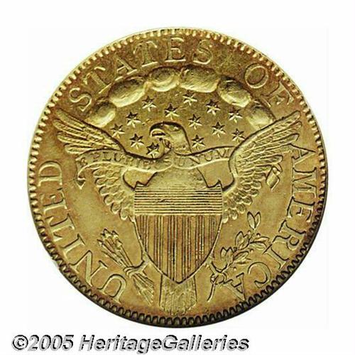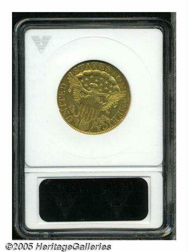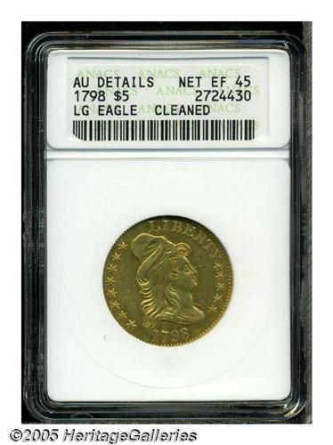 <B>1798<$5> Large Eagle, Small 8--Cleaned--ANACS. AU Details, Net XF45.</B></I> Breen-6431, B. 6-H, Miller-31, R.6. Although lightly cleaned, this rare variety Half Eagle is nonetheless pleasing, since it has retoned in orange-gold hues and has no substantial abrasions. Luster dominates peripheral and recessed areas. Breen 4-F is the usually encountered Small 8 variety, and the devoted specialist should not miss the opportunity to acquire a significantly tougher die pairing.<BR><I>From the Dr. Kurt Peters Collection.</B></I> From the Dr. Kurt Peters Collection.