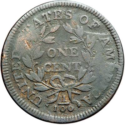 1798/7 S-151 R3. Good-6. Overdate 8 over 7. Style I Hair. Slightly sharper with microscopic roughness under a rather glossy dark olive patina. There is a bit of fine verdigris dusted into protected areas and a short scrape under the first S in STATES. LDS, Breen state VIII late. The die cracks to the top of the E in AMERICA have become a narrow cud break connecting that letter to the dentils above. The date is bold and the overdate feature is obvious. The legends are strong except for those places affected by swelling on the reverse.
