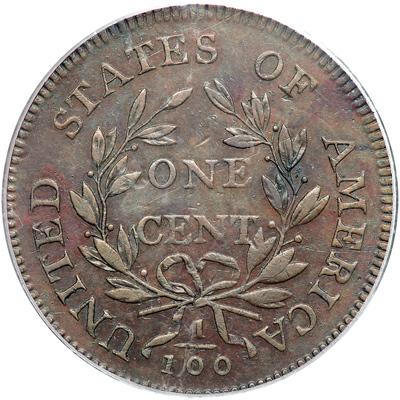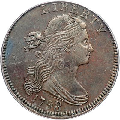 1798/7 S-152 R2+ Style I Hair. Large Overdate 8 over 7. AU-53. Plated in Clapp, Breen, and Early American Cents. Sharpness EF40 or slightly better but there is a scuff of light hairline scratches on the portrait, the strongest single scratch hidden in the hair from the forelock to the hair ribbon. All these marks are old and blended perfectly into the natural toning. A couple shallow planchet chips on the upper part of the neck and a diagonal hairline through NE in ONE are the only additional marks worthy of mention. Glossy mix of medium brown, steel, and light reddish chocolate with a small swipe of darker steel at the dentils left of the hair ribbon. The fields are hard and slightly reflective, especially on the obverse. E-MDS, Breen state II. The obverse is slightly off center to K-12 and the reverse is very slightly off center to K-6. Both sides were plated in Clapp and this is the plate coin for the variety in Breen. The obverse is also plated in Early American Cents. Called EF45 net EF40 and tied for CC#3 in the Noyes census, his photo #22978. Bland also says EF40 but tied for CC#4 honors. Our grade is VF35. DWH #3481.