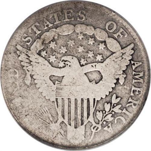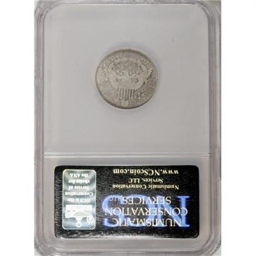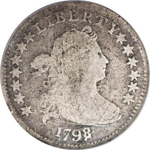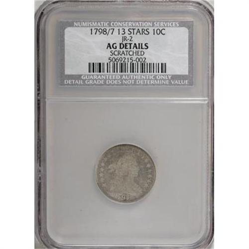 <B>1798/97 10C 13 Stars on Reverse--Scratched--NCS. AG Details.</B></I> JR-2, R.6. Four die marriages are known for 1798 dimes, and each is sufficiently distinct to merit a separate <I>Guide Book</B></I> listing. JR-2 is the rarest 1798-dated variety, and it is unpriced above XF40 in the <I>Guide Book</B></I>. This slate-gray piece has been lightly cleaned, and wispy, hair-thin marks include a vertical pinscratch near the chin. A faint letter P is entered east of the date. Peripheral letters are clear aside from UNITED.<BR><BR><B>Coin Engraver:</B> Robert Scot<BR><BR><b>Shipping:</b> Coins & Currency (<a target="_blank" href="http://www.heritageauctions.com/common/shipping.php">view shipping information</a>)