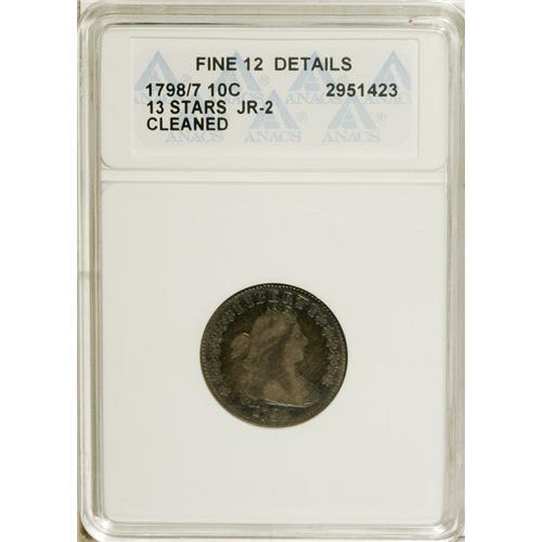 <B>1798/97 10C 13 Stars on Reverse--Cleaned--ANACS. Fine 12 Details.</B></I> JR-2, R.6. Small 8 Over Large 7. On the reverse the 13 stars are arranged 5-6-1-1 in diagonal lines, and there is a large space between star 2 and star 3. The outer berry on the right is beneath the last A in AMERICA. On the obverse ES and O from STATES OF are boldly clash-marked underneath the 98 of the date and the bust tip, respectively. This is the rarest 1798 variety, and specialists will undoubtedly show intense interest in this pleasing piece. Although cleaned long ago, the surfaces have retoned nicely to pinkish-gray and aqua, and while myriad small abrasions appear under a loupe, there are no major surface impairments, and much fine detail remains.<BR><I>Ex: Stack's 71st Anniversary Sale (10/2006), lot 2648.</B></I><BR><BR><b>Shipping:</b> Coins & Currency (<a target="_blank" href="http://www.heritageauctions.com/common/shipping.php">view shipping information</a>)