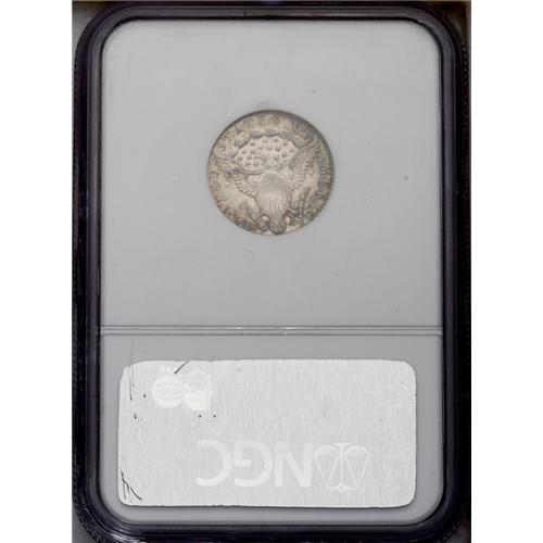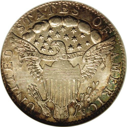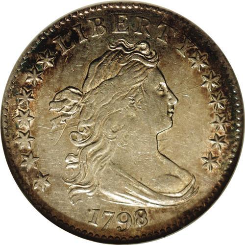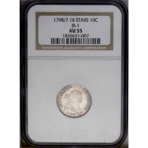 <B>1798/97<10C> 16 Stars on Reverse AU55 NGC.</B></I> JR-1, R.3. JR-1 is the only 1798 dime variety with sixteen reverse stars, and hence ranks as one of the most easily identified varieties in the Draped Bust series. An obvious overdate, the 8 in the date is too small to fully cover the downstroke of the 7. This nicely detailed Choice AU example displays pleasing light gray and mauve patina with some mottled gunmetal-blue near the borders. The design elements are relatively well centered on the planchet. A couple of marks are seen behind Liberty's head on the obverse.
