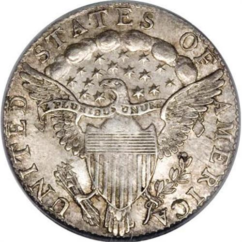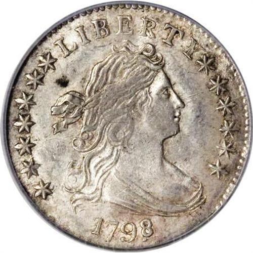 <B>1798/97 10C 16 Stars on Reverse MS62 PCGS.</B></I> JR-1, R.3. Four die varieties of 1798 dimes are known, and each are also listed in the <I>Guide Book</B></I>. The two overdates are easily distinguished by the reverse, having either 16 stars like this example, or 13 stars. The latter is a major rarity. The two normal date varieties are listed in the <I>Guide Book</B></I> as 1798 and 1798, Small 8. The Small 8 variety has four berries in the reverse branch and the Normal or Large 8 variety has five berries in the branch.<BR> Several Mint State examples of this 16 star overdate have been certified, with resubmissions accounting for some of the total. The centers are somewhat weak, but the surrounding details are nearly full. Full luster and faint gray color is accented by wispy champagne toning. A few tiny splashes of darker color are evident on both sides. Population: 4 in 62, 15 finer (7/07).<BR><BR><B>Coin Engraver:</B> Robert Scot<BR><BR><b>Shipping:</b> Coins & Currency (<a target="_blank" href="http://www.heritageauctions.com/common/shipping.php">view shipping information</a>)