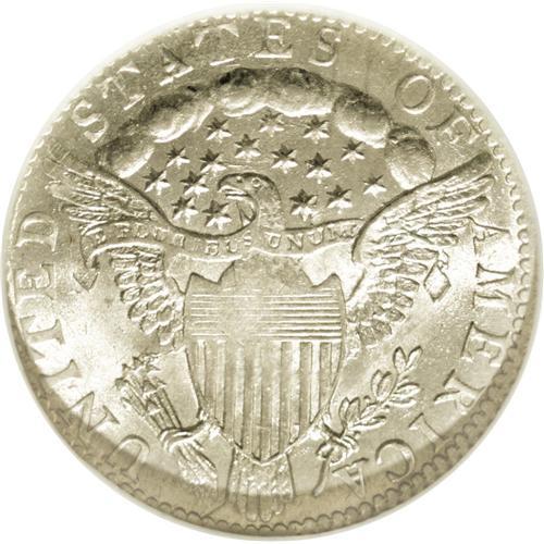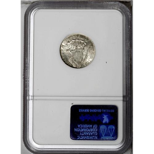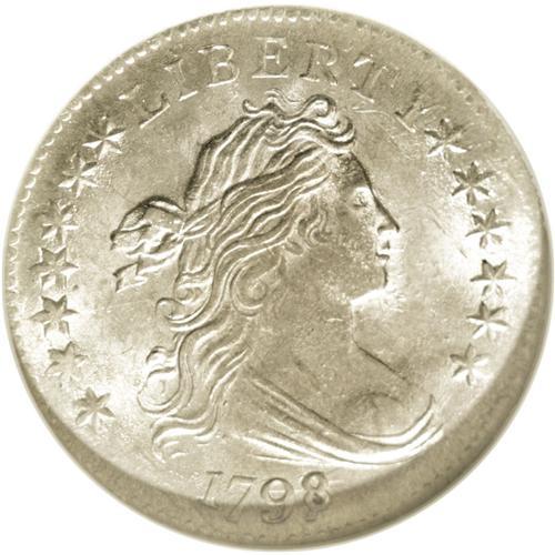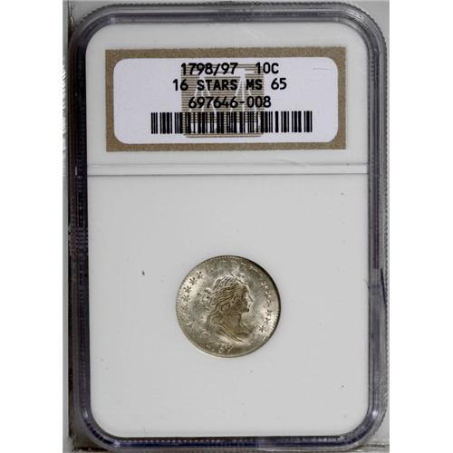 <B>1798/97<10C> 16 Stars on Reverse MS65 NGC.</B></I> JR-1, R.3. This is the overdate obverse with a small 8 cut over a larger 7. The obverse has 13 stars. All of the stars are distant from the devices, and most are distant from each other. On the left, stars 5 and 6 are further apart than others. On the right, stars 11 and 12 are closer than others.<BR> The reverse has 16 stars with two arcs of seven stars each, and a single star on each side of the eagle's head. Each of these stars are from a defective punch and have an extra point. The branch only has four berries with three on the outside and one on the inside. Stars 4, 5, and 6 each touch a cloud, but no other stars touch any of the devices.<BR> One of the great numismatic mysteries surrounds this issue, with 13 stars on the obverse and 16 stars on the reverse. Obviously the 13 obverse stars signify the original 13 states, and the 16 reverse stars signify the 16 states that were part of the Union when these coins were struck. Tennessee was the 16th state, admitted in 1796, and Ohio was the 17th state, but not admitted until 1803.<BR> This is a lovely example with extremely sharp central details on each side and weaker peripheral details. Heavy clash marks are evident in the fields, with minor die chips or cracks. Light obverse die bulges are also evident. The obverse die is extensively lapped, causing much of the lower hair details to be almost or entirely absent. Both sides have frosty luster with brilliant silver surfaces and a hint of champagne toning. An attractive, highly desirable Gem. Census: 5 in 65, 3 finer (7/06).