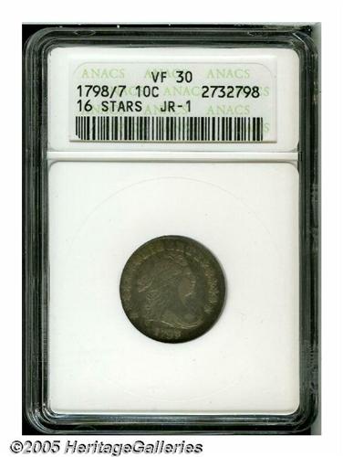 <B>1798/97<10C> 16 Stars on Reverse VF30 ANACS.</B></I> JR-1, R.3. An obvious overdate, the 8 in the date is too small to fully cover the downstroke of the 7. This untroubled early silver type coin has golden-brown and ocean-blue borders that frame the light pearl-gray devices. The centers are typically struck, but traces of luster persist within the eagle's wings.<BR><I>From The Empire State Collection, Part Two.</B></I>