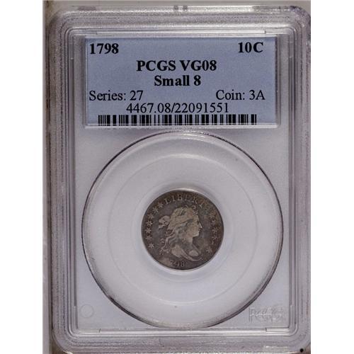 <B>1798/97<10C> 16 Stars on Reverse VG8 PCGS.</B></I> JR-1, R.3. A deep aquamarine and orange-brown example of this first year Heraldic Eagle dime. Portions of the right side obverse stars and the 17 in the date are worn, but wing plumage definition is still present, and several letters in E PLURIBUS UNUM are legible.