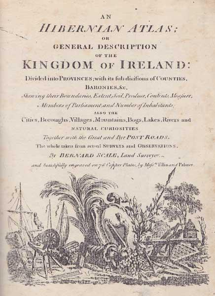 “….shewing their Boundaries, Extent, Soil, Produce, Contents, Measure, Members of Parliament, and Numbers of Inhabitants; also the Cities, Boroughs, Villages, Mountains, Bogs, Lakes, Rivers and Natural Curiosities Together with the Great and Bye Post Roads. The Whole taken from actual Surveys and Observations by Bernard Scale, Land Surveyor and beautifully engraved on 78 Copper Plates by Messrs. Ellis and Palmer.” Engraved frontispiece, half title and 37 full page hand coloured maps including a map of Ireland, a map of each of the four Provinces of Leinster, Munster, Ulster and Connaught and a map of each of the 32 counties of Ireland.