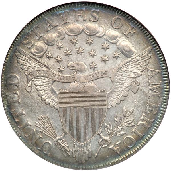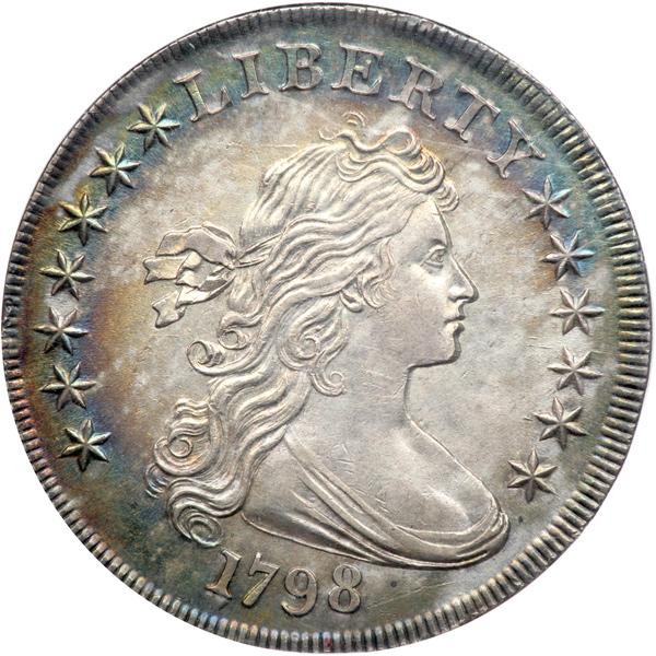 1798 B-27, BB-113 Rarity 2. NGC graded AU-55. Point 9 Close Date. Wonderful lustrous surfaces are flourishing with rich toning atop the silver brilliance. Well struck for the date, with some outstanding details present in Liberty's hair and drapery, the stars and eagle. Fully struck coins of this date are rare. Moreover, they are highly prized by specialists.