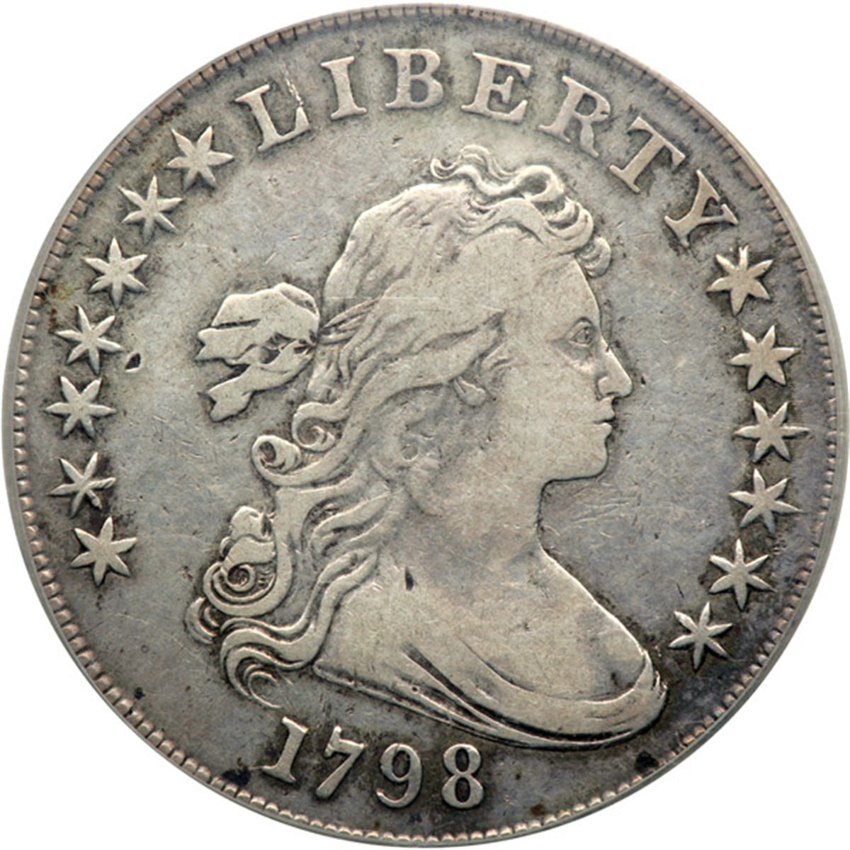 1798 Draped Bust Dollar. Large eagle, 10 arrows. ICG graded VF-20. Lightly toned. We agree with the grade. Only 10 arrows. 5 small berries, 2 top ones closest together. Point of leaf under left lower tip of I in AMERICA. Star distant from eagle's beak. Arc star pattern. Die crack along right wing tip, top of AM to border above E. This is a later state of the reverse that used to have 10 arrows and a headless stick (used to coin 1798 B13 107). For the production of 1798 BB-108, the reverse die was relapped, removing the headless stick.